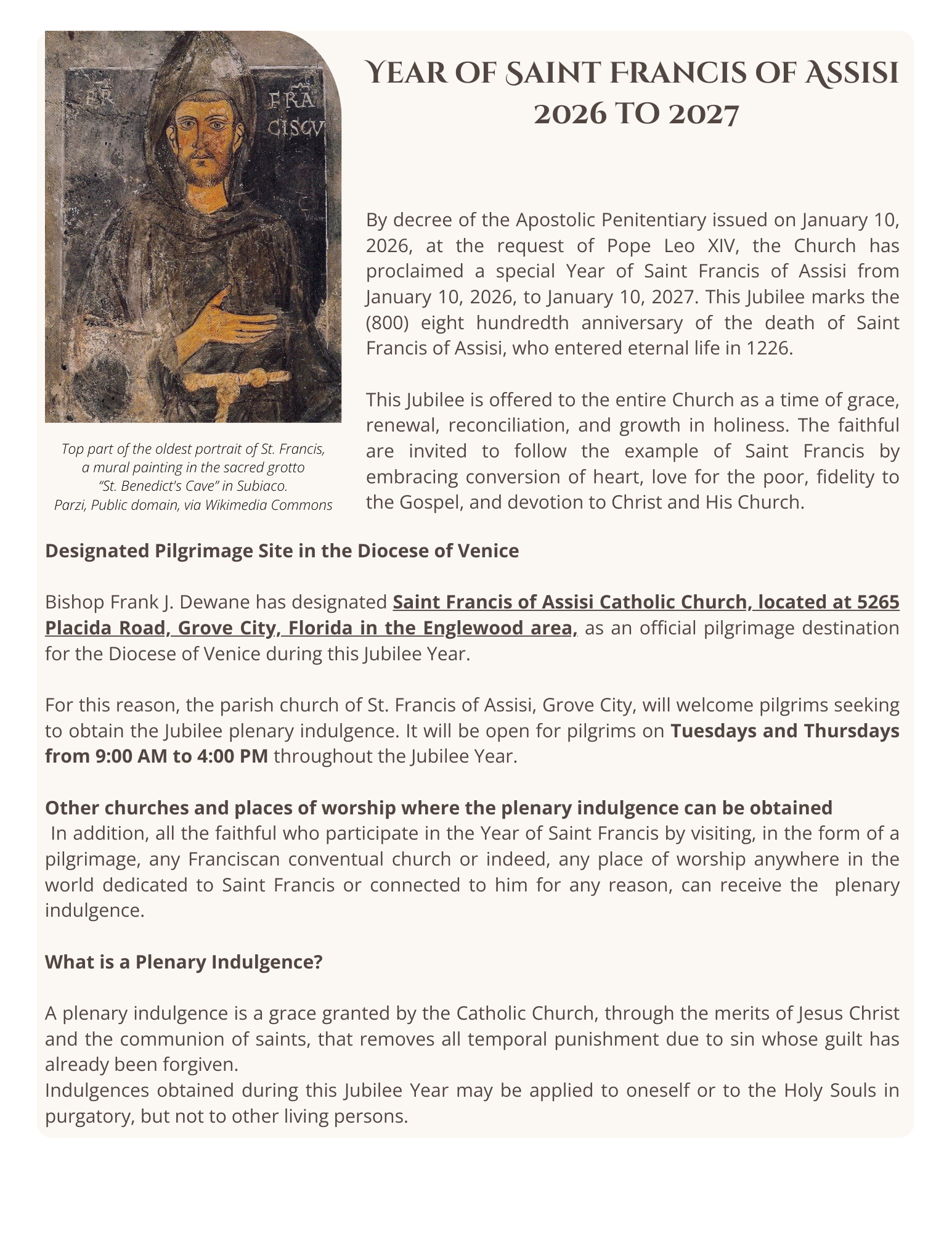 As pilgrims journey to Saint Francis of Assisi Catholic Church in Grove City or to another place of worship associated in any way to St. Francis throughout the world, may this Jubilee Year bear fruit in lives renewed by grace, strengthened in love for Christ and His Church.